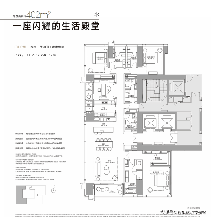 402㎡户型位于T3栋低区3-37F,采用单端头布局,享有三面采光的优势,其空间结构与分区逻辑和 “招商玺家园” 425㎡户型颇为相似,不过整体尺度略逊一筹。户型规划为四卧室 + 家政套间,除书房外其余卧室均为套房设计,充足的居室配置能灵活适配多样化居住需求。公区采用餐客西厨一体化设计,搭配朝南向的客厅与主卧,不仅观景视野绝佳,还能直览海景,社交与居住体验拉满;同时实现主仆双动线规划,进一步提升空间使用的私密性与便捷性。美中不足的是,主卧的整体尺度稍显局促。