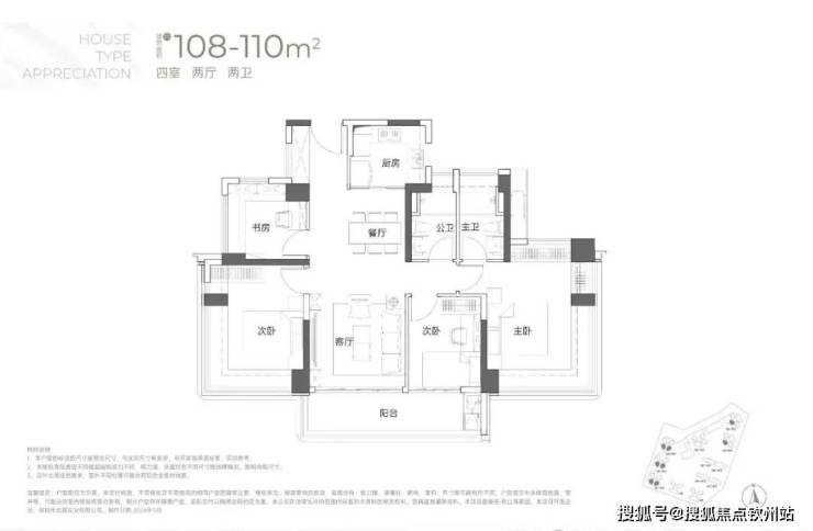 108-110㎡的4房2厅2卫:竖厅双龙抱珠格局,客厅开间3.5米,LDKB一体化,4个卧室分别做到了3.7米/3.4米/2.8米/2.6米的宽度,主卧加2个次卧270°全景飘窗,客厅连接次卧出6.1米长的大阳台,U型厨房,得房率约95-97%(包含赠送),西南或东南朝向。户型分布在1栋1/2/3单元03/04户型,03户型东南朝向,04户型西南朝向;只有2栋2/3单元看小区,其他都看向小区外部;