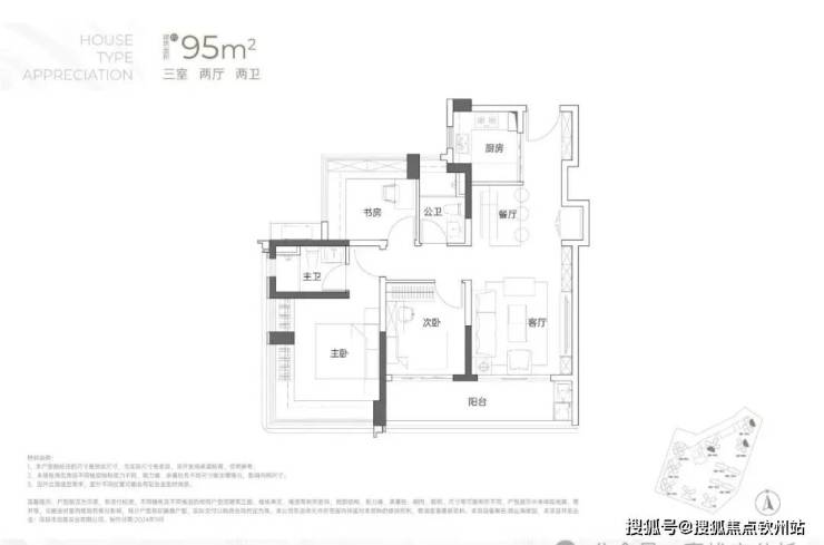 95㎡的3房2厅2卫:传统竖厅格局,客厅开间3.5米,LDKB一体化,S墙设计预留冰箱卡槽位,3个卧室分别做到了3.6米/2.8米/2.8米的宽度,主卧加1个次卧270°全景飘窗,客厅连接次卧出6.3米长的大阳台,U型厨房,得房率约95-97%(包含赠送),西南或东北朝向。户型分布在2栋2/3单元04/05户型,东北朝向看大南山、2栋1单元04/05户型西南朝向看小区;