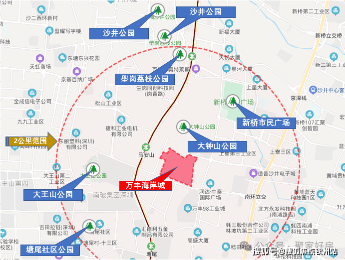 医疗: 项目1公里范围内分布有马鞍山社康,万丰社区社康,除此之外距离项目较近的两所医院是万丰医院和深圳天伦医院,日常小的身体不适可就近就医相对便利。离项目最近的大型公立医院是沙井人民医院,距离项目直线距离约2.75公里,距离稍远,缺少一定便利性,医疗借助交通工具通行。