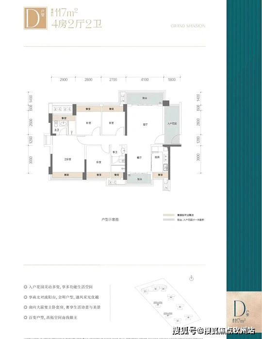 · 117㎡4+1 房两厅两卫:南北双阳台 + 全赠送入户花园,功能齐全,满足改善需求。