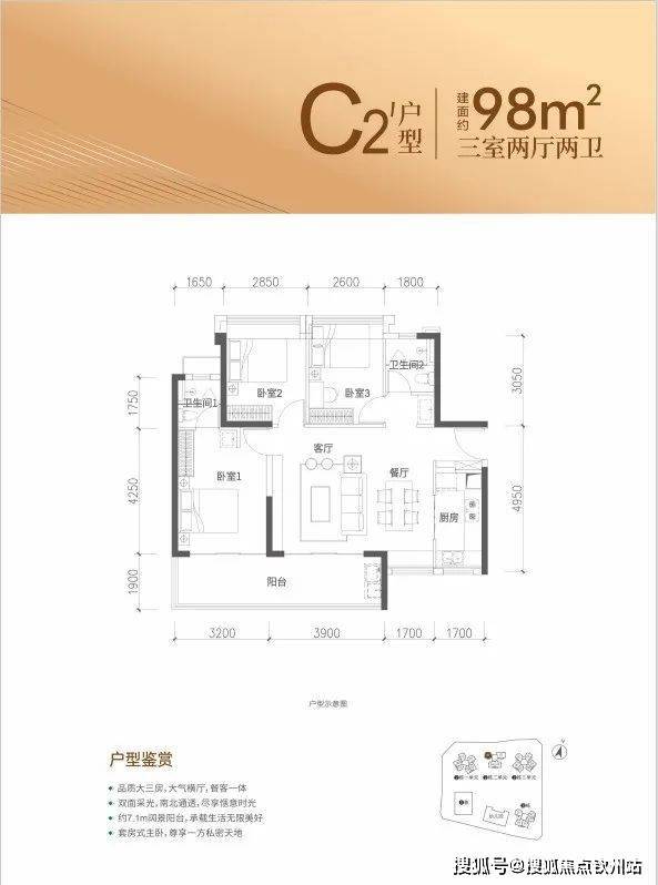 特点:LDKB一体化设计,三开间朝南,主卧14.76㎡(含飘窗),次卧9.06㎡(含飘窗),次卧7.02㎡(含飘窗)。