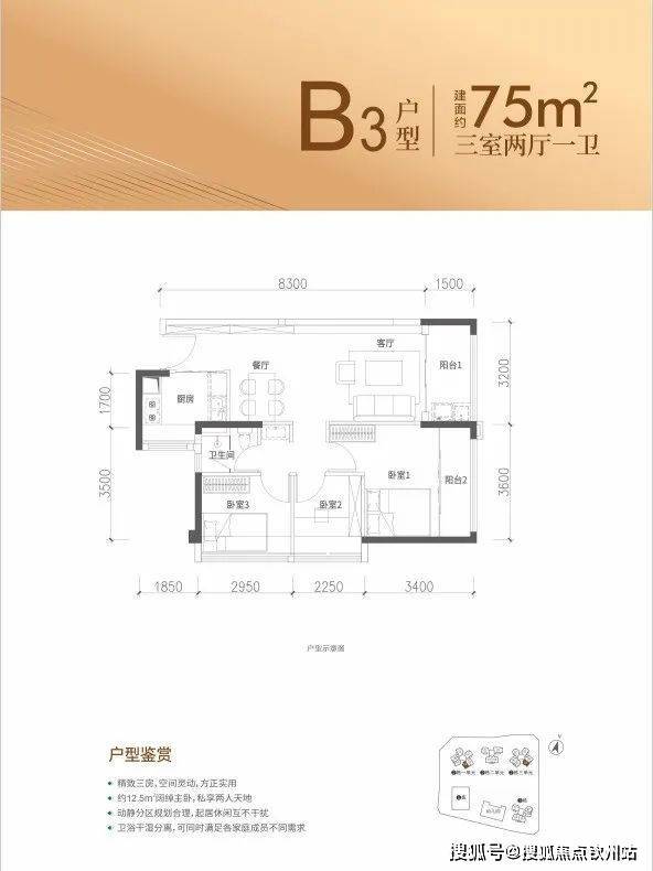75平3房:303-352万