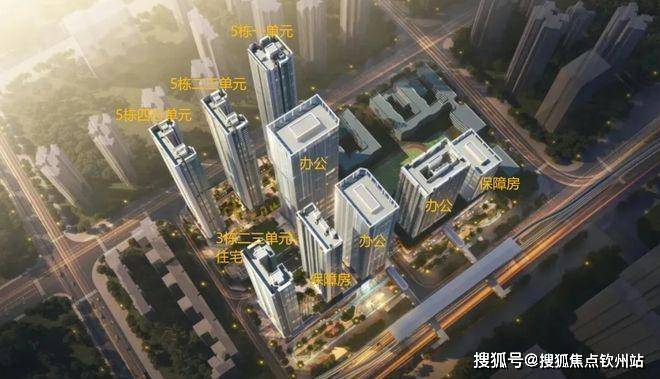共由四栋54-64层的超高层住宅+两栋保障性住房+三栋办公楼组成,另外配建一所12班幼儿园。