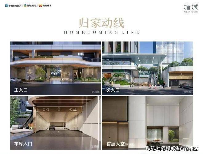 酒店化主入口、次入口、车库入口、首层大堂,酒店化迎宾与归家动线,以无风雨通廊为核,赋予归家更多体验感,带来高效、安心的归家出行之旅。