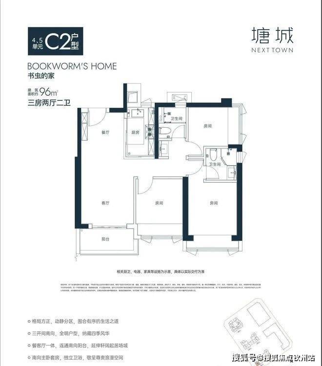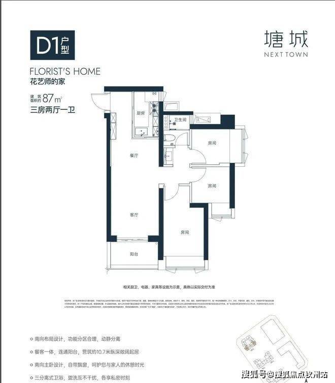 “10.7 m纵深紧凑南向三房”,10.7 m纵深餐客一体,通风采光极佳