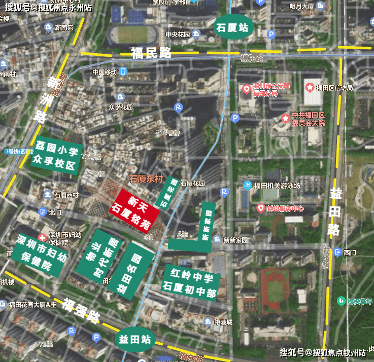 交通配套:项目南邻福强路、西临新洲路; 周边有2个地铁站,分别是3号线益田站,3/7号线石厦站,均在500米左右的距离,临近福田口岸与皇岗口岸,无缝接驳深港两地,穗莞深城际轨道(建设中)2站直达前海,联通两大深港合作区;福田高铁站,快速链接全国。