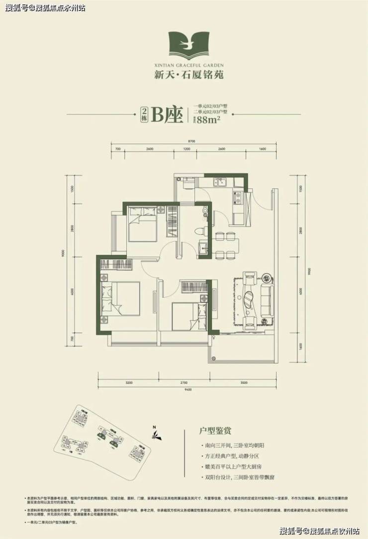 2栋B座一单元02、03户型、2栋B座二单元02、03户型:面积约为88㎡的3房2厅2卫;