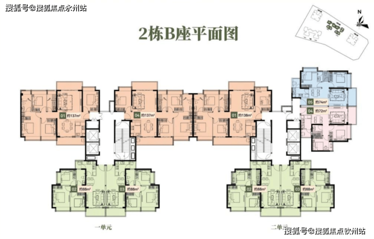 2栋B座一单元01、04户型、2栋B座二单元01户型:面积约为137-138㎡的4房2厅2卫;