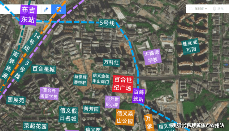 百合世纪广场,位于龙岗区布吉街道惠康路与翔鸽路交汇处,家门口是5号地铁线“百鸽笼站”,北侧是万科红,南侧毗邻百外世纪小学,荔山公园,周边多为小区住宅,居住氛围浓厚,布吉万象汇距离约300米。