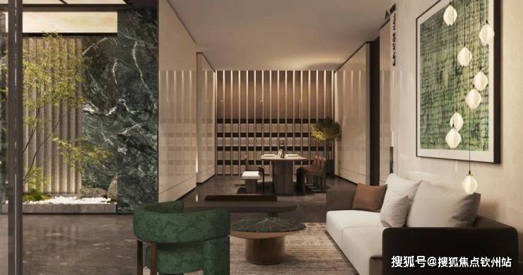 精致镂空格栅吊顶,搭配普拉达绿奢石材迎宾门头以及精装车库墙面,凸显业主归家的尊贵感;