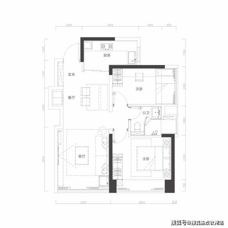 前沿S墙设计,预留冰箱位,空间零浪费;约3.8米面宽大主卧待飘窗
