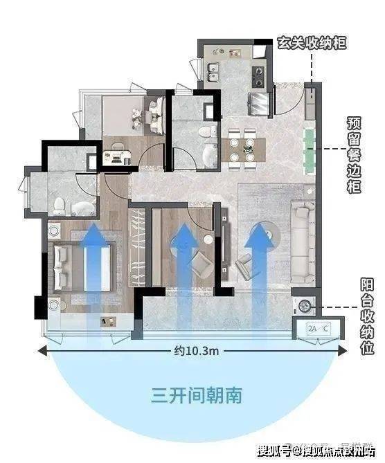 建面约89㎡三房两厅两卫户型(竖厅),做到三开间朝南,突破性的将开间尺度拉伸达到约10.3米。玄关收纳柜、餐桌旁预留餐边柜、阳台设收纳位等多重收纳空间,让日子越过越清爽。