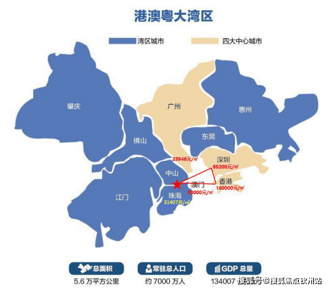地处粤港澳大湾区几何中心,珠海、广州、深圳、香港、澳门环绕。10分钟到珠海主城中心,周边3-5万+/㎡,房价差1/4。