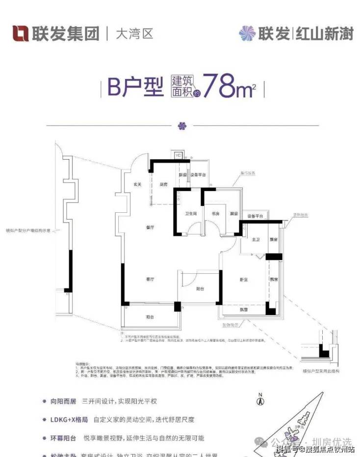 约78㎡的2+1房2厅2卫,设计的是竖厅LDKG+X格局,S墙设计预留冰箱卡槽位,做到了主卧双飘窗,三开间朝南,动静分区,U型大厨房,厨房烟道还做了外置空间,可以更好的利用厨房空间,卫生间三段式干湿分离。赠送了双阳台一半面积+6面飘窗+双设备平台,超100%得房率,东南或西南朝向。这是整个红山板块唯一一个80平以下做到了3房2卫的户型。