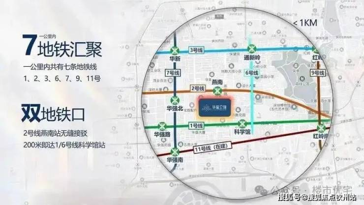 【多维交通】三地铁交汇地铁物业,0距离燕南地铁口(2号线燕南站),约400米到1号线/6号线科学馆站,片区800米内汇集1、2、3、6、7、9、11号七条地铁线,50多个地铁站口。