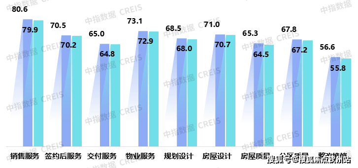 关键指标评价结果显示,服务类指标正逐渐从“前端销售”向“全周期服务”转型,尽管已取得一定进展,但仍存在较大的提升空间。2025年销售服务、签约后服务、交付服务、物业服务满意度较2024年均有不同程度下降,其中销售服务满意度为79.9分,交付服务满意度为64.8分。产品类指标中质量问题突出,房屋质量、公区质量及整改维修指标均呈下行态势,房屋质量评分从2024年的65.3分下滑至64.5分,同时,整改维修的评分也从56.6分下降至55.8分,显示出质量问题的严峻性。