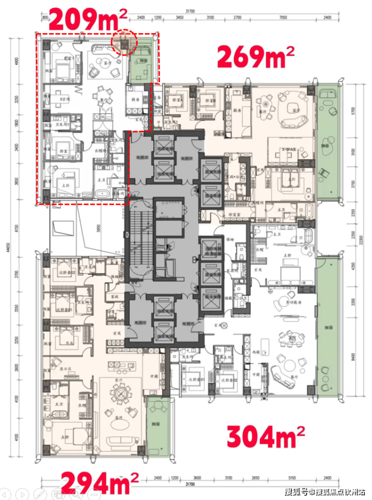 在户型设计上,这个项目的最小户型是209平方米,最大的是1050平方米。但因为是超高层住宅,所以209平的户型,使用上也不宽裕。