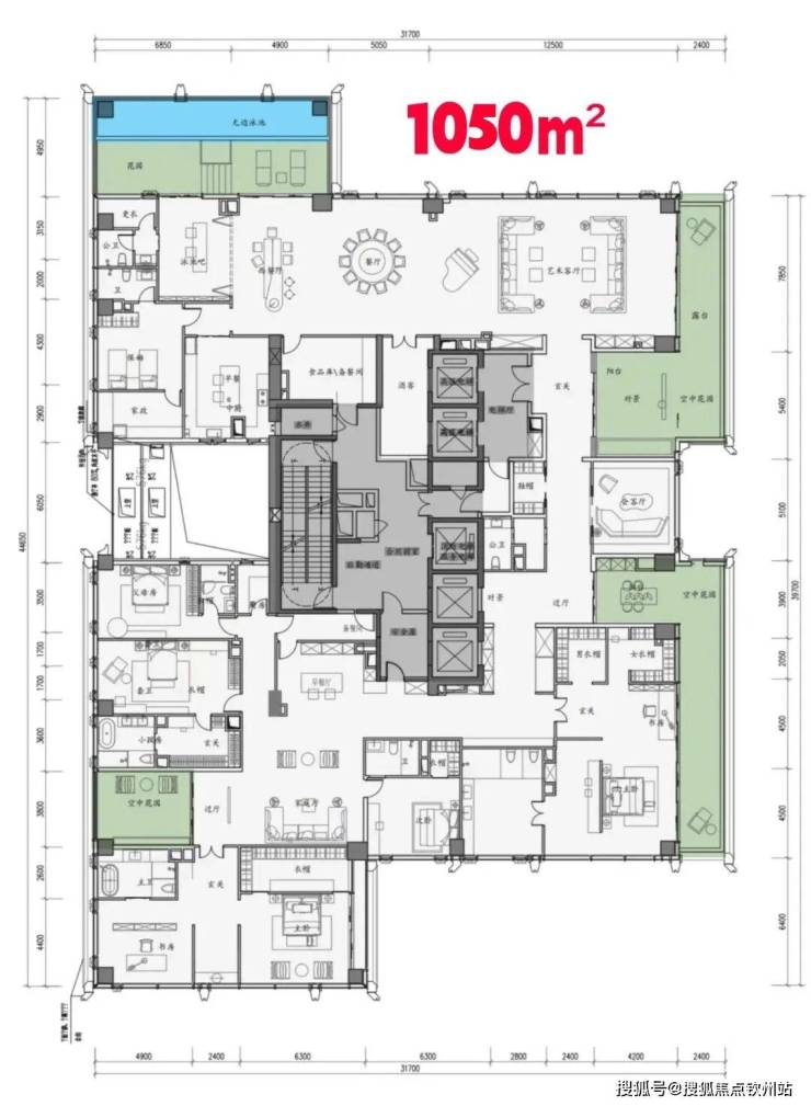 而最大户型1050平,从现在的平面布置来看略显小气。主要原因是核心筒的长度过大,导致两边的空间被分割的过于琐碎。
