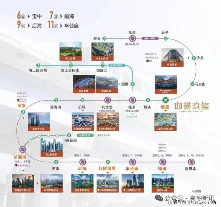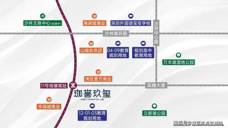 公共交通方面,「珈誉玖玺」位于综合体南侧,临近11号快线塘尾地铁站。