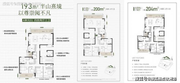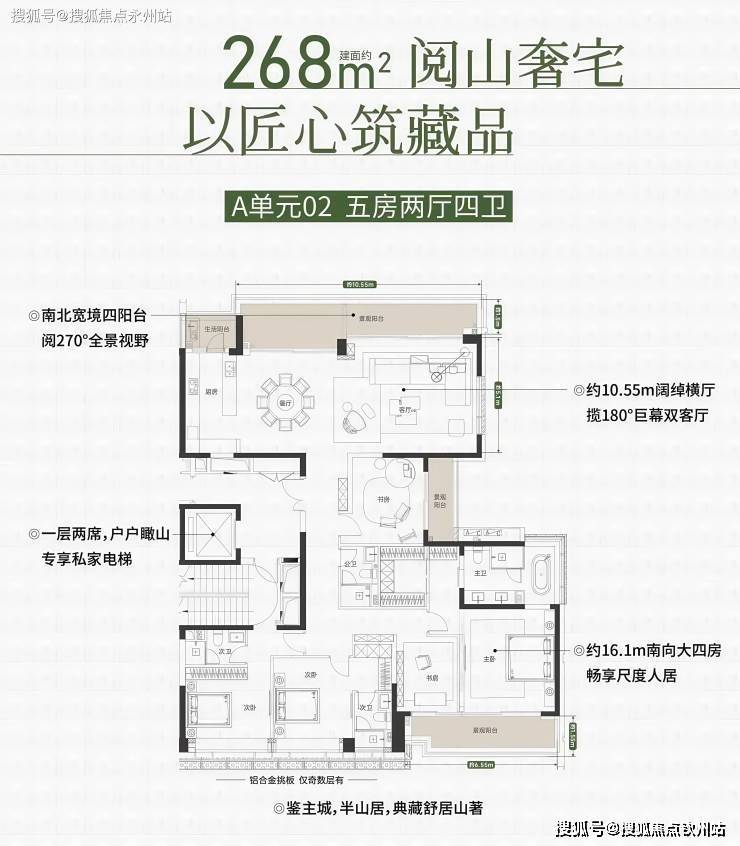 全景视野:南北四阳台设计,270°景观引入室内,主卧带45㎡套间及瞰景阳台。