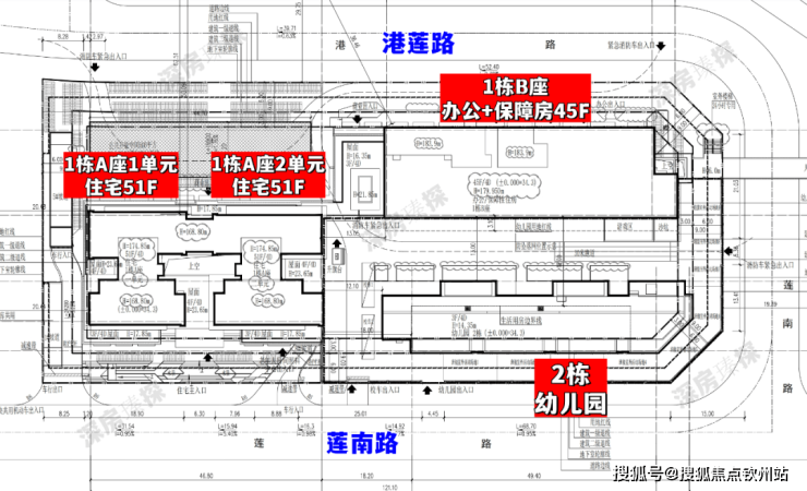 莲塘金岸里,由兆丰源公司打造,其背后股东主要是2家珠宝公司,总占地面积约0.82万㎡,总建筑面积约11.59万㎡,计容建筑面积约8.66万㎡,容积率9.62,绿化率40%,共由2栋45-51层高住宅组成,其中1栋A座1单元/2单元住宅51F,1栋B座办公+保障性住房45F,2栋是1所幼儿园。