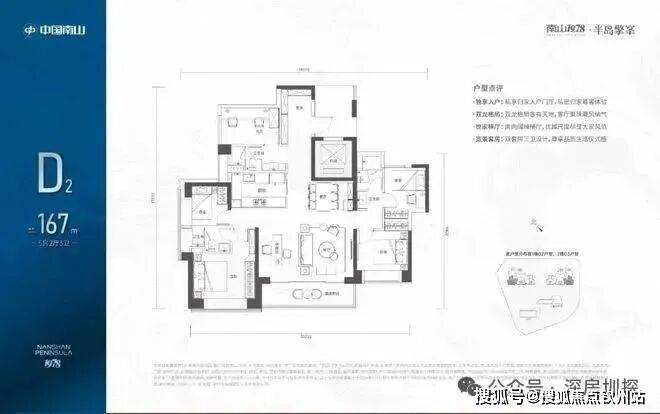 167㎡的5房2厅3卫,1栋02/2栋03高区户型,电梯入户送独立公区,设计的是竖厅双龙抱珠格局,四开间朝南,超宽敞客厅巨幕阳台,主卧大套间设计,U型厨房,双公卫三段式分离,得房率:72.07%(不含赠送),西南朝向。