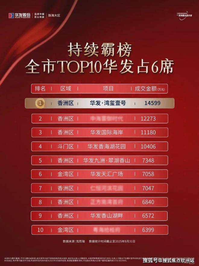 华发再次斩获珠海成交金额榜首!全市TOP10中华发占据6席,据克而瑞数据显示,华发2025年成交金额、套数、面积已连续8个月位居珠海TOP1,用实打实的业绩印证“龙头效应”。