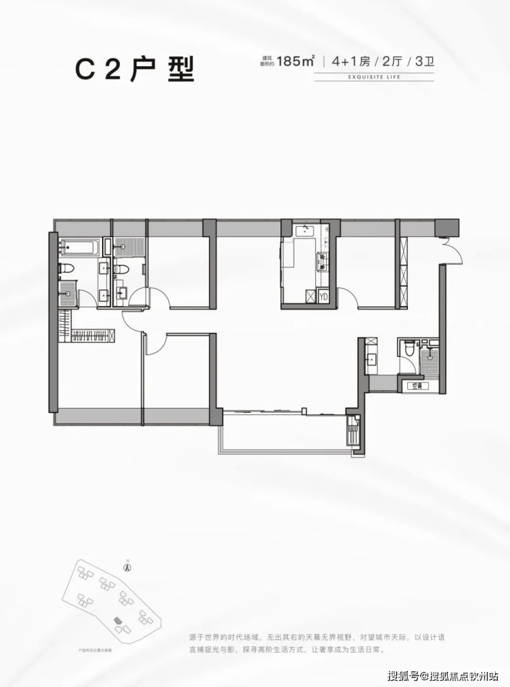 185平:5房2厅3卫,南北通透,使用率77.43%(不包含赠送)185㎡的4房2厅3卫,楼王单位,3梯3户,设计的是创新式横厅南北通透格局,客厅6.75米开间,餐客厅一体化,三开间朝南,设计有2个独立套房,L型厨房,得房率:77.44%(不含赠送),阳台主朝西南向。
