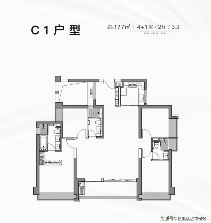177平:5房2厅3卫,西南朝向,使用率77.43%(不包含赠送)177㎡的4房2厅3卫,楼王单位,3梯3户,设计的是竖厅双龙抱珠格局,客厅6.7米开间,超大方形客厅,4个卧室分别做到了4.12米/3.33米/2.68米/2.68米的宽度,设计有2个独立套房,U型厨房,得房率:77.43%(不含赠送),西南朝向。