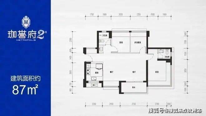87㎡的3房2厅2卫,设计的是横厅南北通透格局,客餐厅6.2米开间,3个卧室分别为3.3/2.65/2.35米的宽度,主卧270°环幕飘窗视野,U型厨房,得房率:77.54%(不含赠送),阳台进深1.7米,主朝东南朝向。
