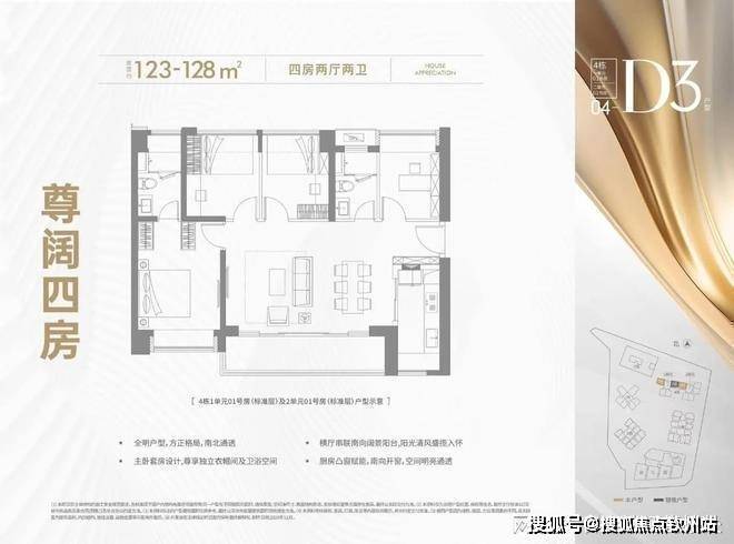 123-128㎡的4房2厅2卫,设计的是横厅南北通透格局,客厅开间6.6米,正南,东南跟西南朝向。