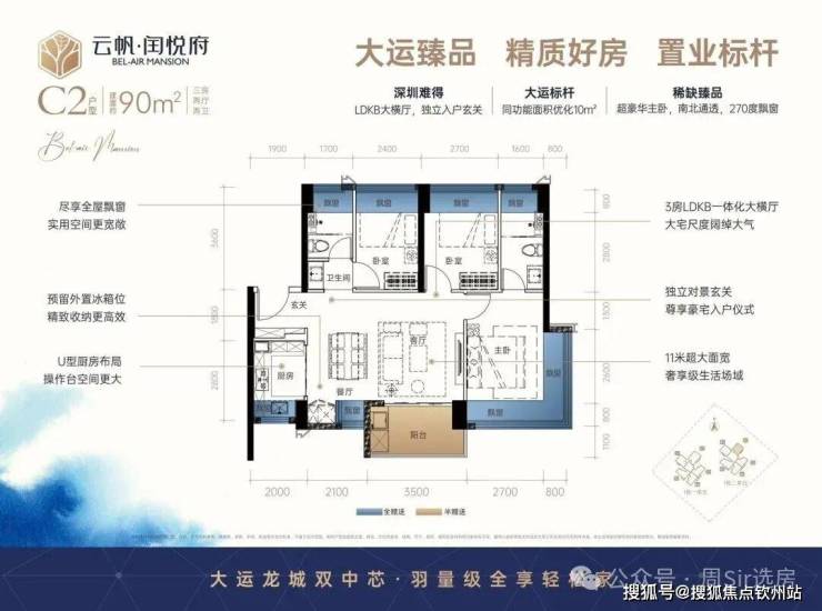 90㎡3房2厅2卫:设计的是经典横厅格局,LDKB一体化,进门入户玄关,客厅带3.5米阳台,U型厨房,主卧南北通透270度景观,卫生间干湿分离。