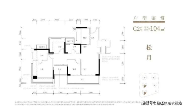 104㎡的4房2厅2卫,C1-C2户型,设计的是经典竖厅格局,进门入户玄关,客厅3.5米开间,LDKB一体化,S墙设计预留冰箱卡槽位,动静分区,四开间朝南,分别做到了主卧17.98㎡/次卧8.37㎡/次卧8.1m²/次卧7.75㎡(包含墙体飘窗),L型厨房,公卫干湿分离带1个约2m²的设备平台,得房率约79.2%(不含赠送),客厅连接次卧出9.6m²的观景大阳台,东南或西南朝向。套内面积82.58m²+赠送面积23.86m²=实用面积106.44m²,加上赠送后得房率约102.04%。