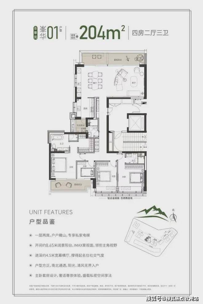 同样的专梯入户,豪宅感扑面而来,该户型为顶级大户型,四阳台设计,最大有10.55米的景观阳台和180度视野的餐客厅空间奢阔气场尽显,罕见的南北瞰景四阳台设计,让家的每个角落都能欣赏美丽的山景和城市景观。所有的开窗面都尽可能放大,客餐厅、书房、卧室、几乎都能享受超宽超大屏