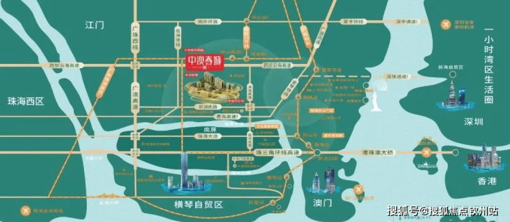 自驾:门前环市南路接造贝立交,约 7 公里到拱北口岸,15 分钟达珠海华发商都,30 分钟到横琴,接驳深中通道 / 港珠澳大桥,畅享双城生活圈中澳地产。
