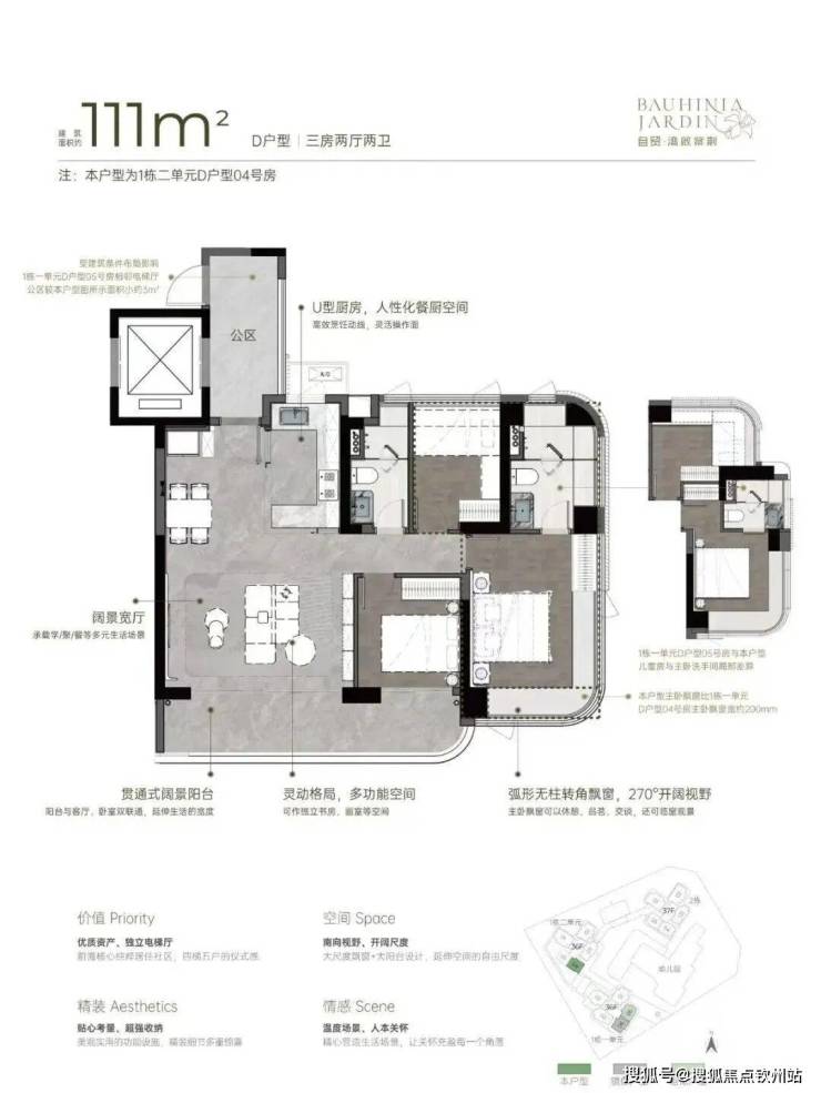 湾啟紫荆位于前海妈湾听海大道,占地约1.5万㎡,住宅建面约6.6万㎡,容积率5.14,共有三栋住宅组成,层高36-37F,共485户,车位595个,车位比1.1.2,4梯5户,主推约96㎡稀缺三房、111㎡3+1房、122㎡四房、142㎡四房。户型设计了大客厅、宽景阳台、阔景飘窗等,拥有山海河多重景观资源,计划品质精装交付。户型采用建筑新规设计,户户大阳台,4梯5户,分布式电梯设计,独立电梯厅。