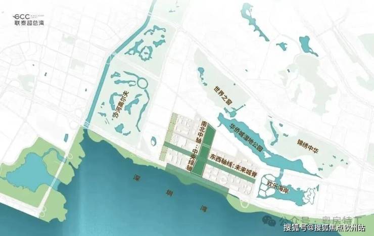 深超总采用院士总控制,由孟建民院士领衔总设计师团队,汇聚全球顶尖设计力量。其核心创新是"一心双核,十字生境"的空间结构,以中央绿轴为南北轴线,连接塘朗山与深圳湾,形成"通山达海"的生态廊道。