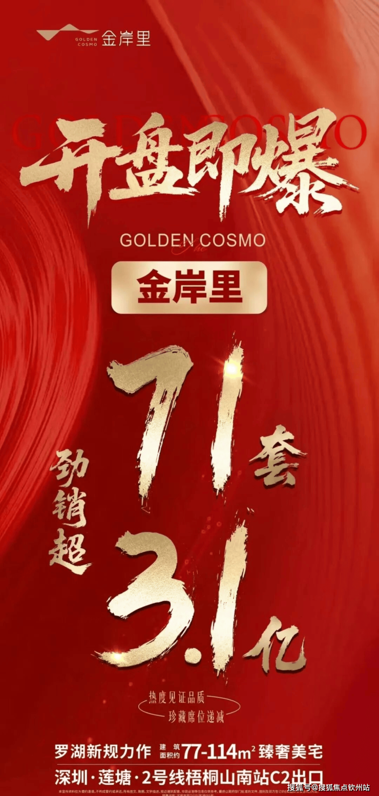 罗湖金岸里已取证,将于9月26日晚上6点正式开盘。开盘享受81折优惠,折后价格382万起,备案均价62400元/㎡,备案总价472-1065万。开盘卖了71套,劲销3.1亿。