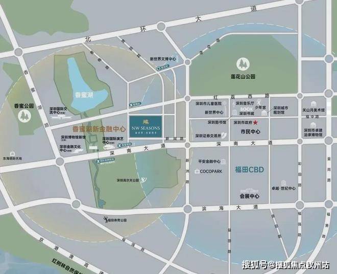 新世界香蜜四季家园位于香蜜湖新金融中心附近,按照目前规划,香蜜湖新金融中心主要分为北区和中区,中区未来将规划落成深圳金融文化中心、深圳博物馆、深圳国际演艺中心三馆,北区是深圳国际交流中心。