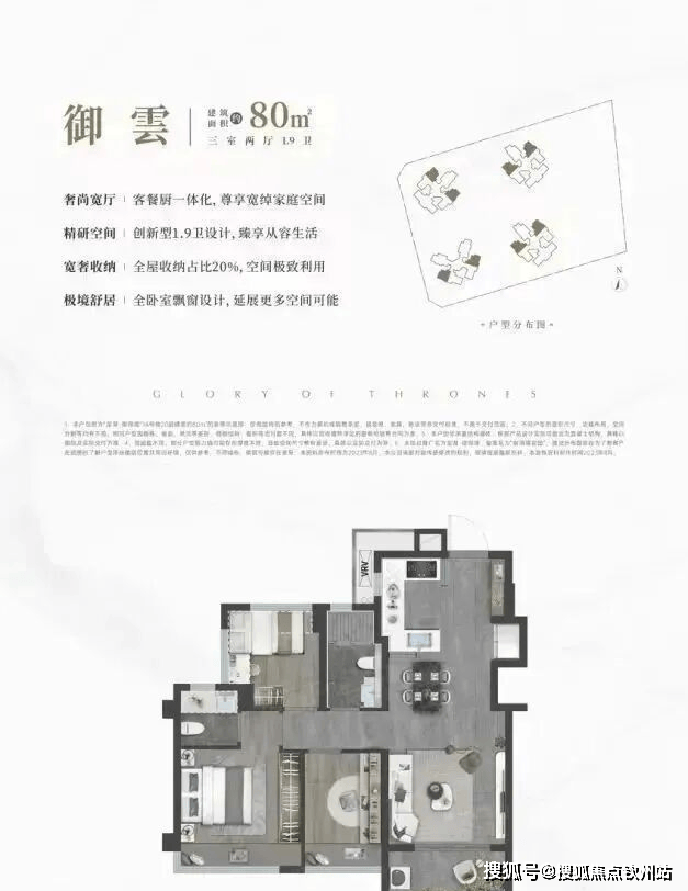 80㎡的3房2厅1.9卫,设计的是竖厅格局,客厅开间3.4米,LDKB一体化,S墙设计预留冰箱位,U型半开放式厨房,创新式1.9卫设计,得房率:78.99%(不含赠送),有西北、西南、东北、东南4个朝向。