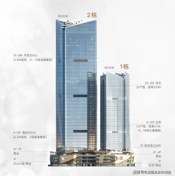 项目产品:楼高 122 米,共 35 层:裙楼商业( 1-4 层);架空层泛会所(5 层)