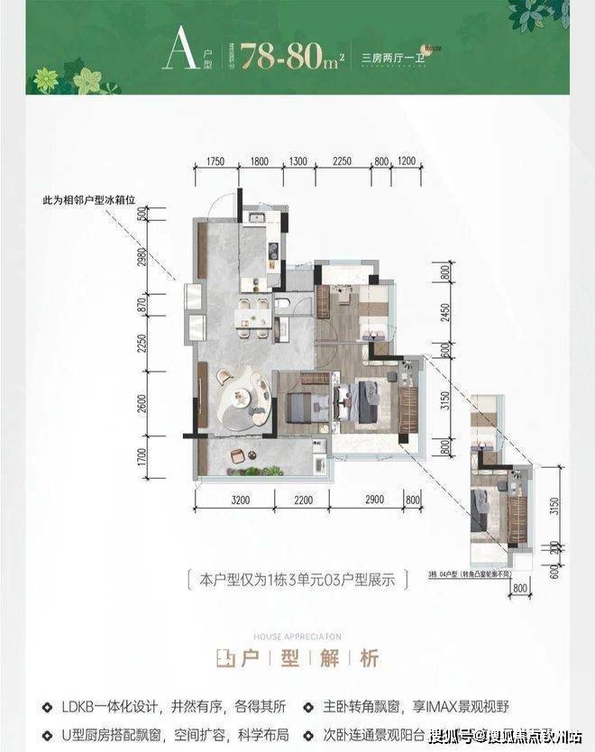 【建面78-82㎡3房1卫】这个面积段主要位于1栋3单元的03/04户型,西北朝向,看海上田园和海景。