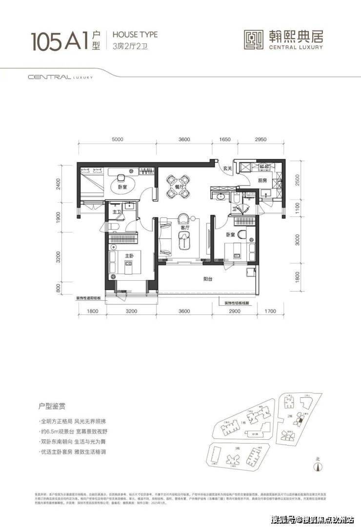 105A1户型3房2厅2卫,经典的双龙抱珠格局,约23㎡阔气通厅分隔主卧与客卧,私密度较高。