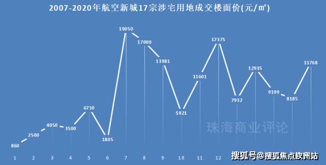 自2007年拍出第一宗地起,13年航空新城一共出让17宗住宅用地,地价从860元/㎡上升到最高19050元/㎡,涨幅达22倍!