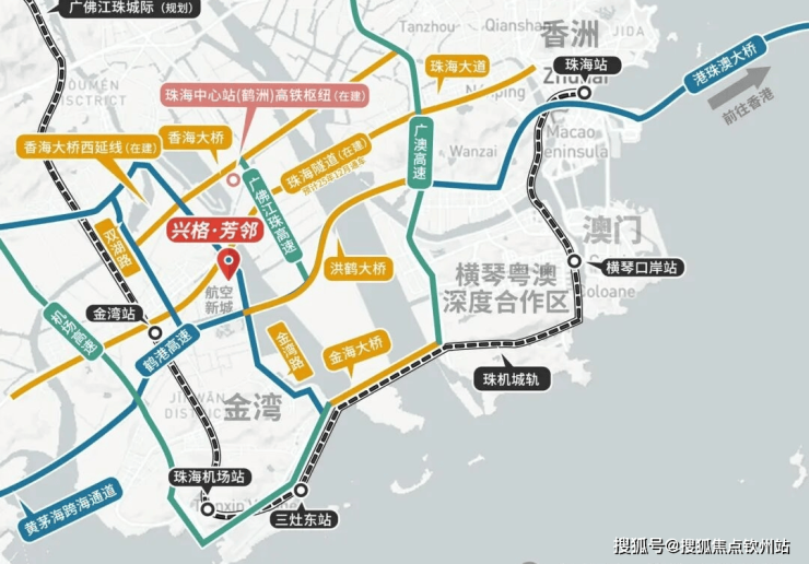 机场一一珠海机场,轻轨一一珠机城际、广佛珠江城轨(规划中),高速——西部沿海高速、珠三角环线高速、广澳高速,大桥一一金海大桥、洪鹤大桥、珠海大桥、香海大桥,速达全市、延伸港澳、通达全国。