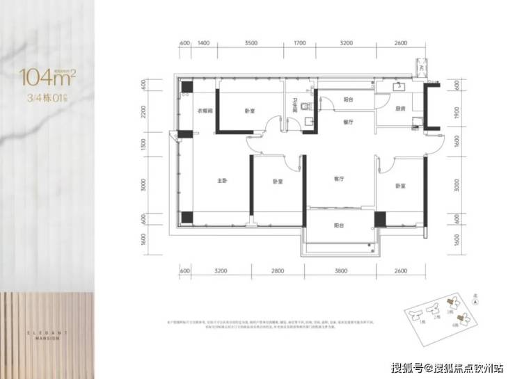 104㎡的4房2厅2卫,3/4栋01户型,设计的是竖厅南北通透格局,进门入户玄关,客厅3.8米开间,LDKB一体化设计,四开间朝南,4个卧室分别做到了主卧19.09㎡/次卧9.57㎡/次卧9.46㎡/次卧8.48㎡(包实测面积,去掉墙体),U型厨房,卫生间干湿分离,得房率约103.9%(包含赠送),阳台主朝西南向。