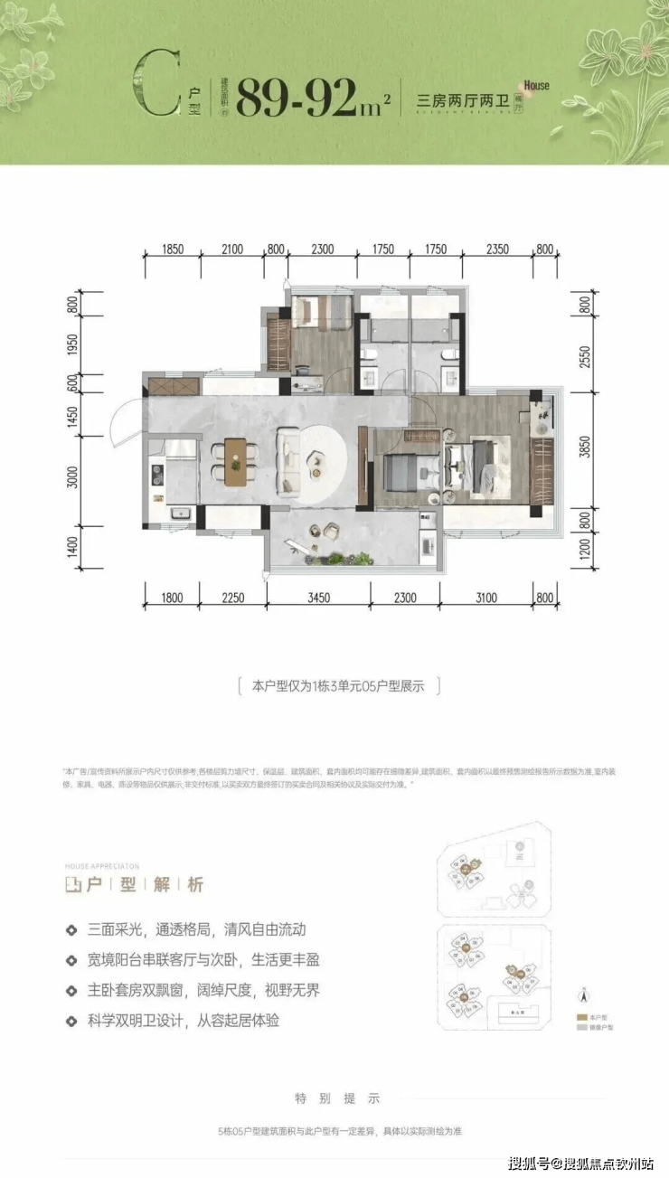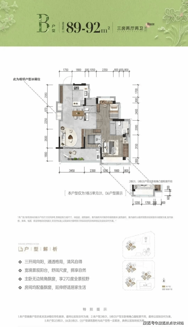 首次推首北地块1栋3单元,约80-92㎡ 3房,共195套,新规使用率高达96%-105%!