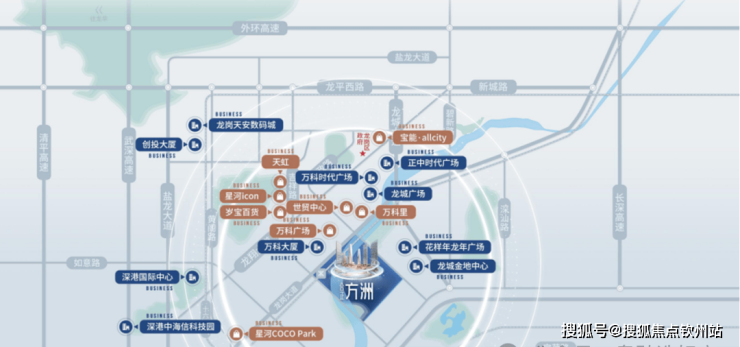 1公里内聚合行政集群(20+政务机构)、商务高地(万科/珠江等超百万方写字楼)、文化地标(25万㎡三馆一城)及七大商圈(万科广场、宝能all city等)