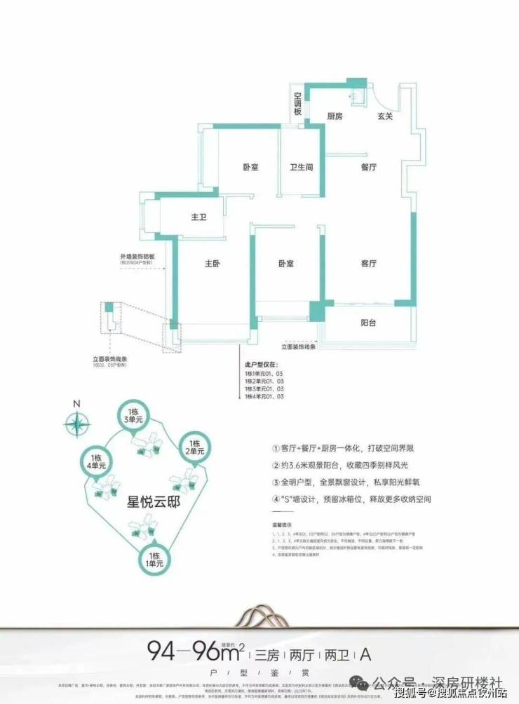 94㎡的3房2厅2卫,设计的经典竖厅格局,客厅3.6米开间,客餐厨一体化,S墙设计预留冰箱位,三开间朝南,U型厨房,得房率:78.15%(不含赠送),有西南及东南朝向。